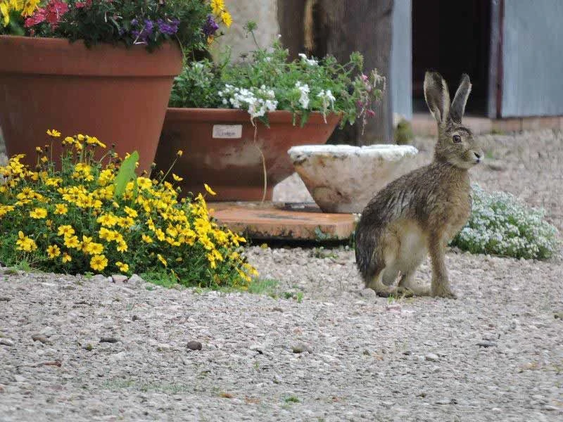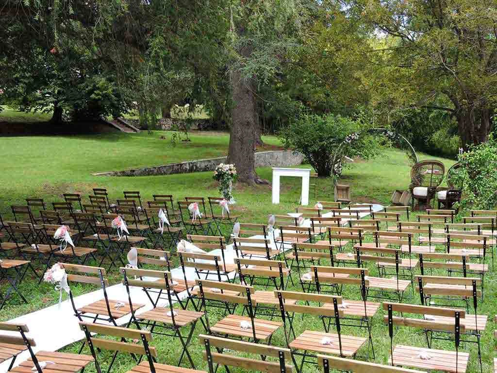 La salle s'ouvre en 2 larges ouvertures vers l'extérieur et ses nombreux coins détente, à l'ombre des platanes, près de la petite fontaine ou sur les bancs de jardin disséminés ça et là.